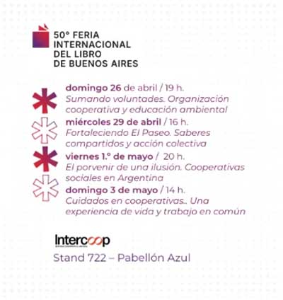 La editorial cooperativa Intercoop participará en la 50° Feria Internacional del Libro de Buenos Aires, que se llevará a cabo del 23 de abril al 11 de mayo en el predio de La Rural. Su stand, ubicado en el Pabellón Azul (N° 722) de la Cámara Argentina del Libro, será un punto de acceso a material educativo especializado en cooperativas.
